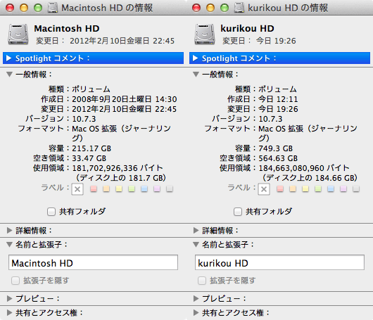 2月26日の手記に書きましたが、メインマシンであるMacBook(late2008 alminum)のハードディスク残容量が少なくなったので、土曜日にグッドウィルへ行って日立の750GBを買ってきました。