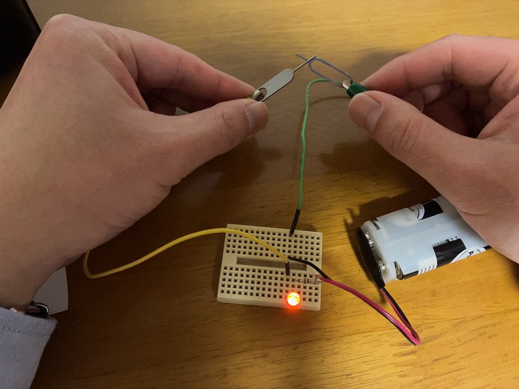 こんなこともあろうかと、小型ブレッドボード、抵抗、LED、単3乾電池2本の電池ホルダ、006Pスナップ、片側がピンで他方がワニ口クリップのワイヤー、SIMピン2本を持ってきている。